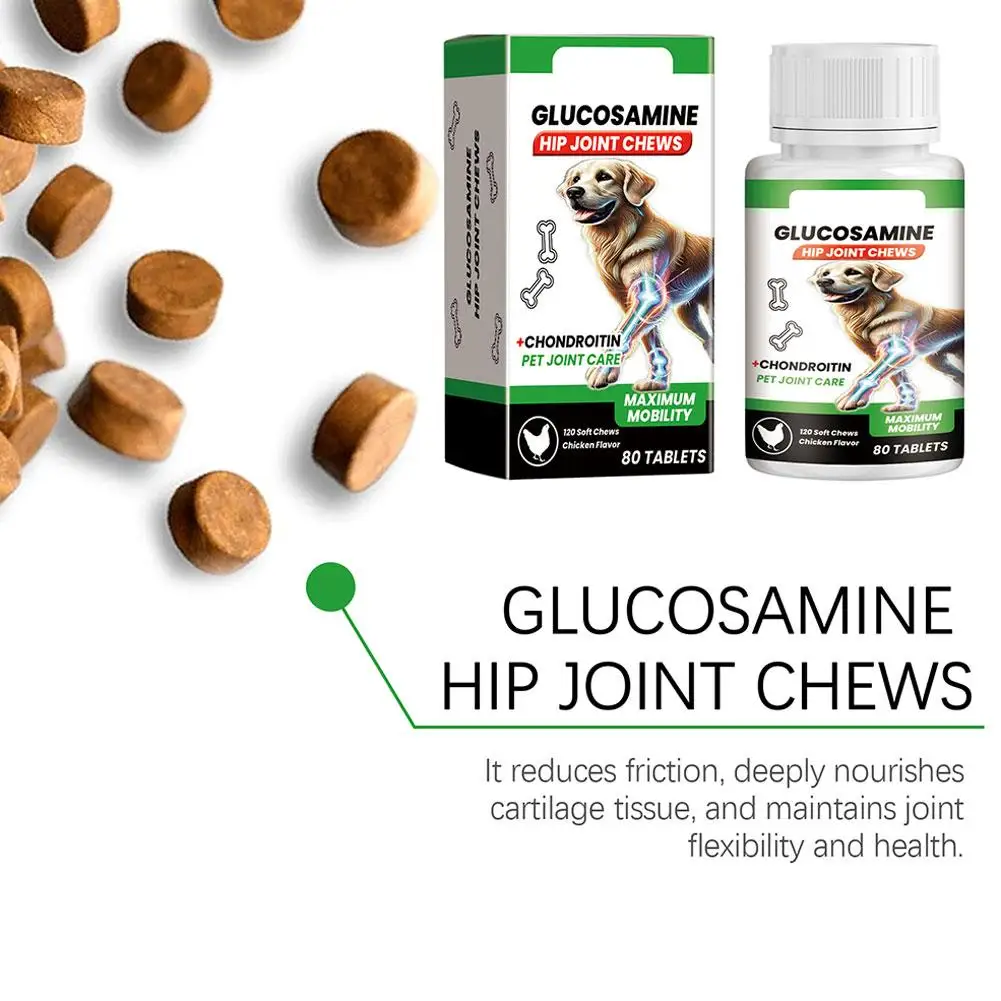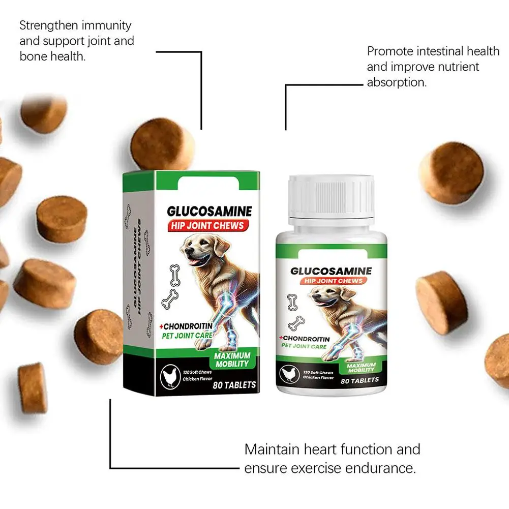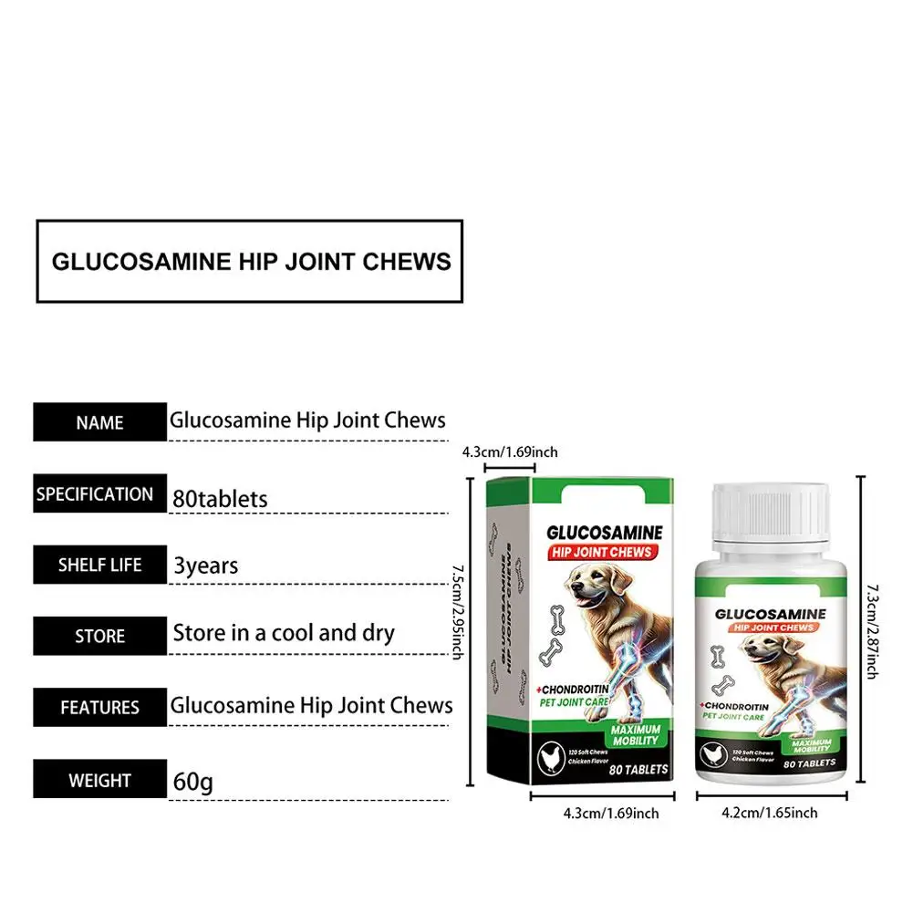Features: Our canine joint care tablets contain meat and meat products, dextrin, and glucosamine hydrochloride. It can quickly relieve joint pain in dogs and improve their daily activity levels. Joints move more freely, making it easier to cope with daily exercise. It’s easy to use: 1. Feed directly or mix with the dog’s regular diet; 2. For dogs weighing less than 5 kg: 1-2 tablets daily; for dogs weighing 5-10 kg: 3-4 tablets daily; for dogs weighing >10 kg: 5-8 tablets daily. Effectively relieves joint discomfort, allowing dogs to enjoy the freedom of running, improving their quality of life, and keeping them energetic and agile every day.